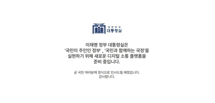 대통령실은 최근 홈페이지 안내 문구를 "이재명 정부 대통령실은 '국민이 주인인 정부', '국민과 함께하는 국정'을 실현하기 위해 새로운 디지털 소통 플랫폼을 준비 중입니다"라고 바꿨다.