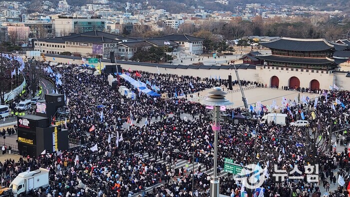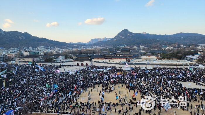 [뉴스힘=박노신 기자] 윤석열즉각퇴진 사회대개혁 비상행동이 28일 오후 서울 종로구 광화문 앞 ‘윤석열 즉각 퇴진! 사회대개혁! 범시민 대행진’을 진행했다. 이곳에 모인 50만명의 시민이 집회가 끝나고 경복궁 앞에서 안국동을 거쳐 명동까지 도로를 따라서 도도한 강물처럼 넘처 흘렀다.
