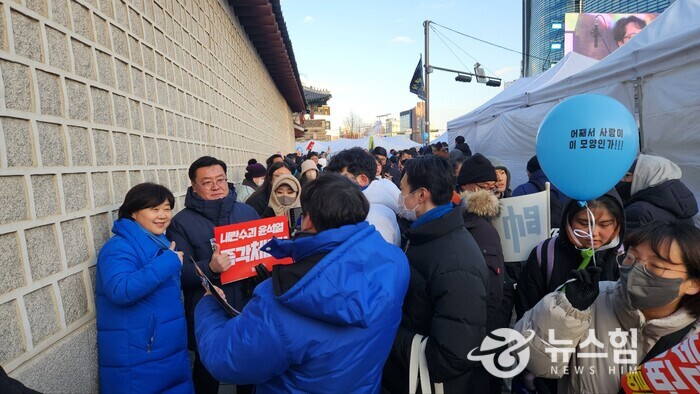 | ▲ 서영교 더불어민주당(서울시 중랑갑)의원이 집회에 참여한 시민들과 함께 하고 있다. |