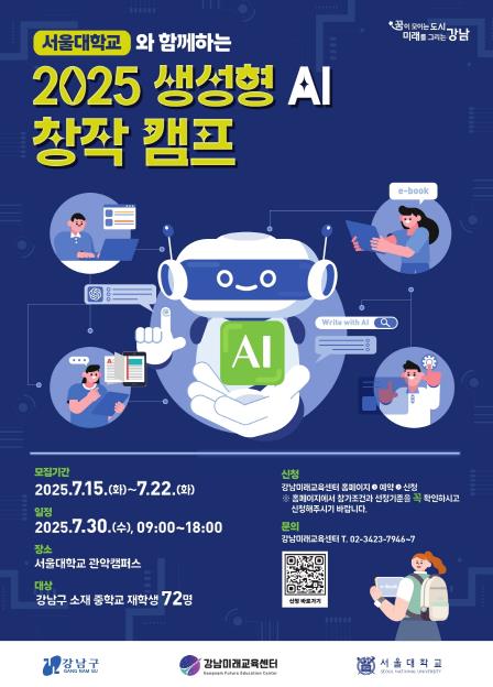 [뉴스힘=박노신 기자] 꿈이 모이는 도시, 미래를 그리는 강남구가 오는 7월 30일 서울대학교 관악캠퍼스에서 중학교 1∼3학년 학생 72명을 대상으로 ‘생성형 AI 창작 캠프’를 연다.