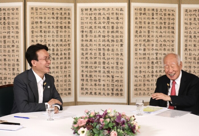 | ▲ 김민석 국무총리가 31일 삼청동 총리서울공관에서 열린 K-토론나라 '촐이의 인터뷰'에서 신동식 한국해사기술회장과 대한민국 조선 산업 관련 토론을 하고 있다.(국무조정실) |