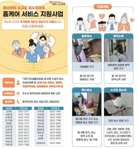 [뉴스힘=박노신 기자] 꿈이 모이는 도시, 미래를 그리는 강남구가 취약계층을 대상으로 청소 및 집수리 등을 지원하는 ‘홈케어 서비스’를 시행한다.