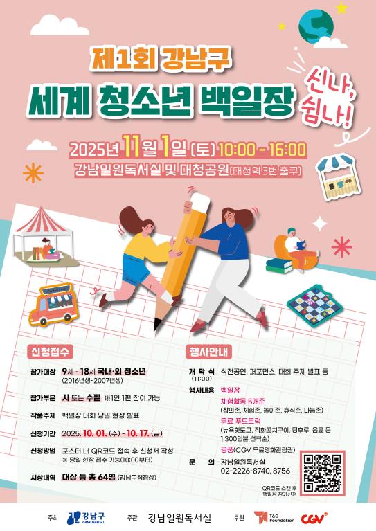 [뉴스힘=박노신 기자] 꿈이 모이는 도시, 미래를 그리는 강남구가 오는 11월 1일 오전 10시부터 오후 4시까지 강남일원독서실과 대청공원 일대에서 ‘제1회 강남구 세계청소년백일장 신나, 쉼나!’를 개최한다. 이 행사는 국내‧외 국적 청소년이 함께하는 전국 최초의 기초지자체 주관 백일장으로, 다문화 시대와 K-컬처 확산 흐름에 발맞춘 문학축제다.