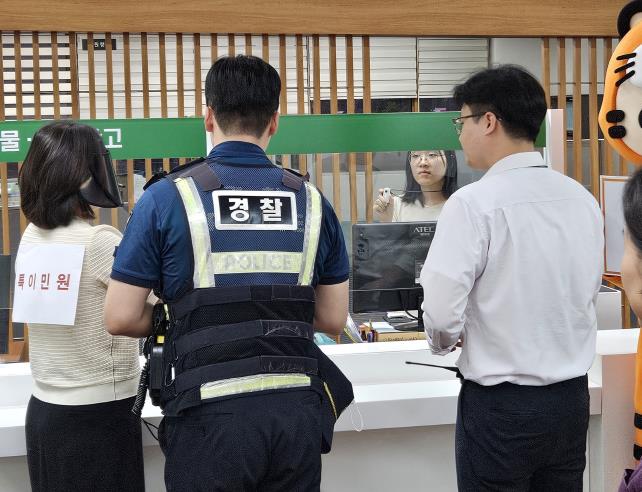 지난 17일, 구청 2층 민원실에서는 고성이 울리며 실제상황을 방불케 하는 모의훈련이 실감나게 펼쳐졌다. 관할 파출소·경비업체 등과 사전협의를 거쳐 경찰관, 청사 안전요원 등이 자리한 가운데 실시된 합동훈련이었다.