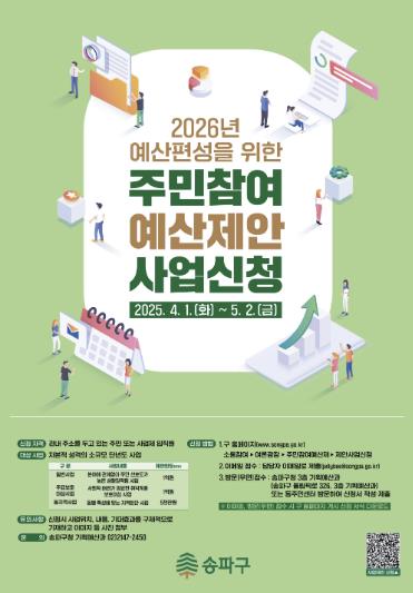 [뉴스힘=주신락 기자] 송파구가 오는 5월 2일까지 2026년 구 예산편성을 위한 주민참여예산 제안사업을 공모한다고 7일 알렸다.
