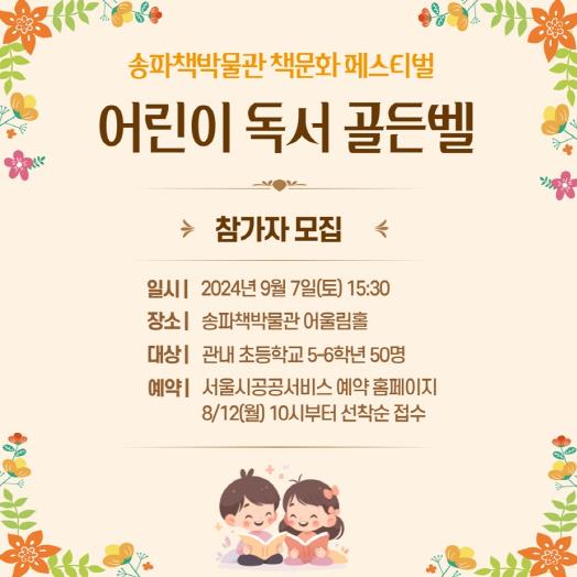 특히, 책문화 페스티벌의 하이라이트는 ‘어린이 독서골든벨’ 대회다. 어린이 독서골든벨은 오는 9월 7일 15시 30분부터 송파책박물관 1층 어울림홀에서 진행된다.