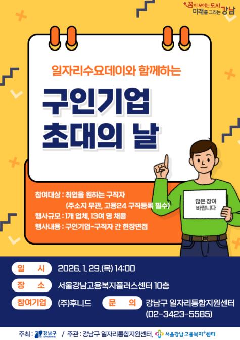 [뉴스힘=박노신 기자] 꿈이 모이는 도시, 미래를 그리는 강남구가 구인기업과 구직자를 현장에서 연결하는 소규모 채용 행사 ‘구인기업 초대의 날’을 기업 수요에 맞춘 수시 운영 방식으로 개편하고, 오는 1월 29일 오후 2시 서울강남고용복지플러스센터에서 현장면접을 진행한다.