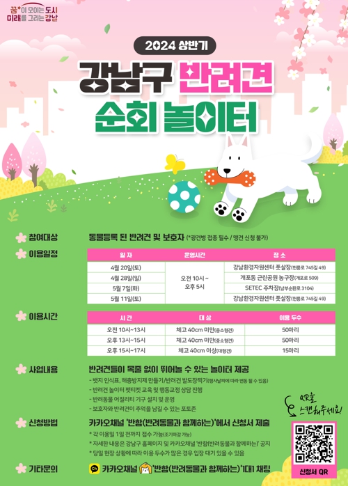 상반기 일정은 ▲4월 20일 강남환경자원센터 풋살장(헌릉로745길 49) ▲4월 28일 개포동근린공원 농구장(개포로 509) ▲5월 7일 SETEC 주차장(남부순환로 3104) ▲5월 11일 강남환경자원센터 풋살장에서 열린다. 놀이터에는 반려견들이 뛰어놀 수 있는 다양한 어질리티 시설과 포토존을 설치한다. 부대행사로 반려견 배지 인식표·아로마 해충방지제 만들기, 펫티켓 교육 및 행동 교정 상담, 반려견 발도장 찍기 이벤트를 준비했다.
