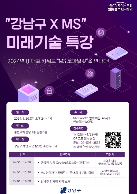 [뉴스힘=박노신 기자] 꿈이 모이는 도시, 미래를 그리는 강남구가 오는 26일 오후 2시~4시 충현교회 갈릴리홀(테헤란로27길 40 본당 1층)에서 마이크로소프트와 함께하는 미래기술 및 취업특강을 개최한다.