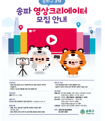 올 한해 활동할 영상크리에이터 3기는 오는 3월 10일까지 모집한다. 분야 제한 없이 ‘송파’를 주제로 이야기가 가미된 영상콘텐츠를 제작하여 송파구를 대표하는 유튜버로 구정 활동에 참여하게 된다.