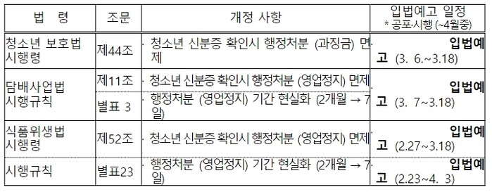 | ▲ 청소년 신분확인 관련 행정처분 법령 개정 현황 및 일정 (일정 변동 가능) |