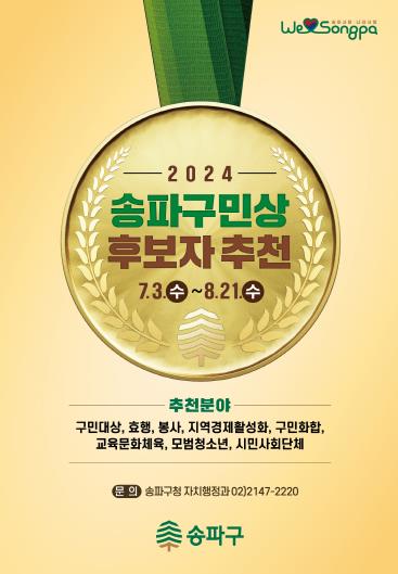 추천된 후보자는 송파구 구민상심사위원회의 엄격한 심사를 거쳐 선정되며, 오는 9월 송파구민의 날 기념행사에서 시상할 예정이다.