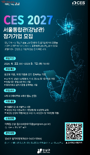 [뉴스힘=박노신 기자] 꿈이 모이는 도시, 미래를 그리는 강남구가 세계 최대 IT·전자 전시회인 CES 2027을 무대로 관내 스타트업의 글로벌 진출 지원에 나선다. 강남구는 ‘CES 2027 서울통합관(강남관)’에 참여할 스타트업을 지난 4월 22일부터 5월 12일까지 모집한다.