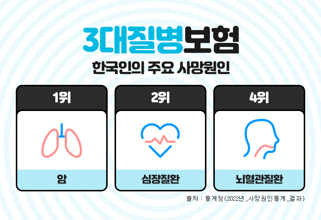 [뉴스힘=박노신 기자] 3대질병으로 일컬어지는 암, 뇌혈관질환, 심혈관질환은 한국인의 주요 사망원인에서 상위를 차지하고 있으며, 이에 대한 진단비를 집중적으로 보장해 주는 보험상품을 3대질병진단비 보험이라 할 수 있다.