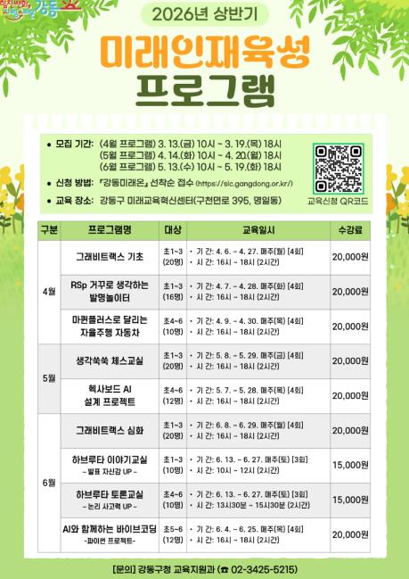[뉴스힘=박노신 기자] 서울 강동구는 초등학생의 창의적 사고력과 문제해결 역량을 키우기 위해 2026년 상반기 ‘미래인재 육성 프로그램’을 운영한다고 밝혔다.