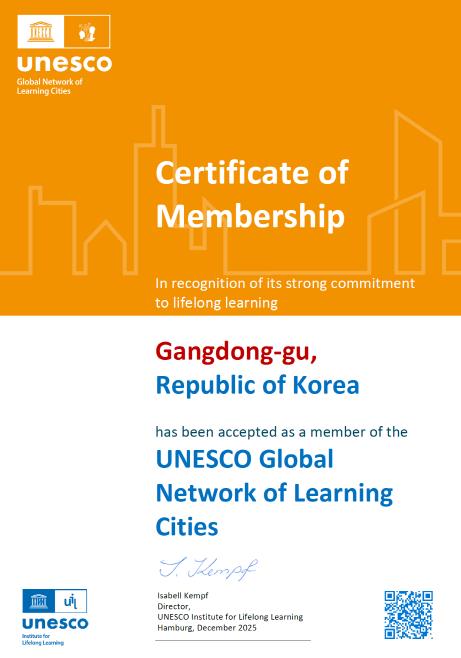 [뉴스힘=박노신 기자] 서울 강동구는 지난 5일, 유네스코 글로벌 학습도시(GNLC: Global Network of Learning Cities)로 최종 선정되며 우수한 평생교육 인프라와 정책을 국제적으로 인정받았다고 밝혔다.