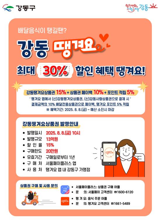 이수희 강동구청장은 “강동땡겨요상품권 발행은 소상공인들의 실질적인 매출 증대는 물론, 구민들께도 체감도 높은 소비 혜택을 제공하는 정책”이라며, “앞으로도 공공배달앱 활성화와 지역경제 회복을 위해 실효성 있는 지원책을 꾸준히 마련하겠다”라고 말했다.