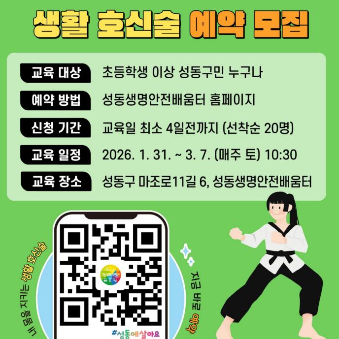 [뉴스힘=박노신 기자] 서울 성동구가 구민의 생활 안전 역량 강화를 위해 성동생명안전배움터에서 ‘2026년 생활 호신술 안전교육’을 운영한다.