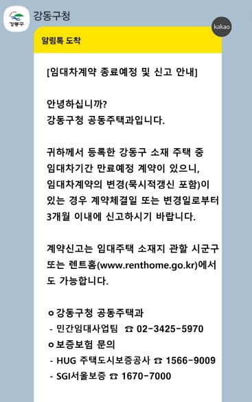[뉴스힘=박노신 기자] 강동구는 이번 3월 말부터 민간임대사업자의 주요 의무사항인 임대차계약 신고 시기 및 중요 공지사항 등을 효과적으로 안내하기 위해 ‘사전 알림톡 서비스’를 실시할 예정이다.