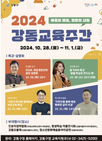 29일에는 강동아트센터에서 ‘2028 대입개편전략 끝장설명회’와 ‘강동 청소년 문화예술 동아리 공연’이 열린다. 특히, 이번 대입 설명회는 교육부 2028 대입개편 자문위원 안성환 교사가 강의할 예정이어서 학부모들의 많은 주목을 받고 있다.