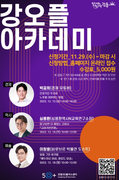 이번 강오플아카데미는 12월 12일부터 18일까지 총 3회에 걸쳐 운영된다. 강사로는 ▲56만 구독자를 보유한 경제 유튜버 박곰희 작가 ▲여러 방송에서 진정성 있는 역사 이야기를 전하는 심용환 역사학자 ▲그림 읽어주는 남자 이창용 전 루브르 박물관 도슨트를 초청해 경제, 역사, 예술 분야에 대한 지식의 향연을 펼친다.