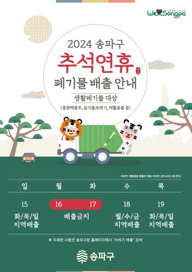 특히, 연휴 기간 중 쓰레기 배출 금지를 집중 홍보한다. 기존의 매주 토요일 쓰레기 배출 금지가 유지됨에 따라 9월 14일과 함께 16일, 17일에도 쓰레기를 배출하면 안 된다. 종량제봉투·음식물쓰레기·재활용품·대형폐기물 모두 배출이 금지된다. 15일과 18일에는 오후 6시(일몰) 이후부터 배출이 가능하다.