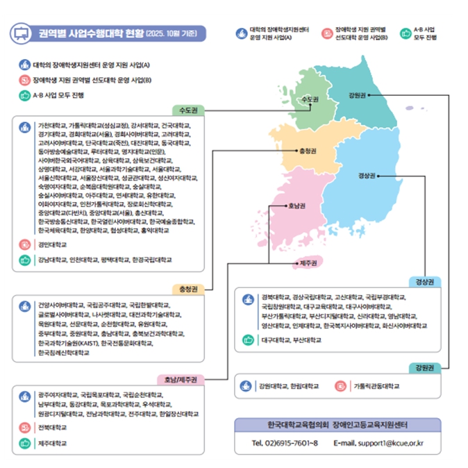 장애인고등교육지원센터는 2025년 ‘대학의 장애학생지원센터 운영지원 사업’을 통해 98개 대학에 교육지원인력과 보조공학기기 등을 지원하고, ‘장애학생 지원 권역별 선도대학 운영 사업’을 통해 10개 대학을 지정하여 진로탐색부터 취업까지 지원한 바 있다. 또한, 대학 현장의 전문성을 강화하기 위해 대학 담당자 직무교육·자문(컨설팅)과 ‘대학의 장애학생 지원 매뉴얼’ 수정·배포도 추진했다.
