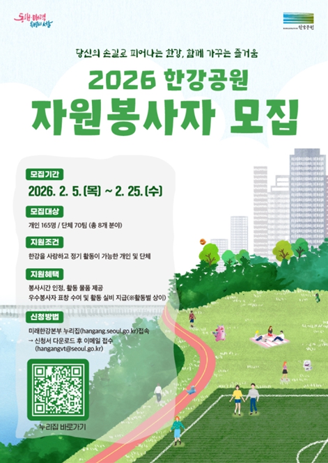 [뉴스힘=박노신 기자] 서울시 미래한강본부가 시민의 손길로 한강의 가치를 피워내고 함께 가꾸는 즐거움을 공유할 ‘2026년 한강공원 정기 자원봉사자’를 모집한다. 접수 기간은 2월 5일부터 2월 25일까지 약 3주 간이다.
