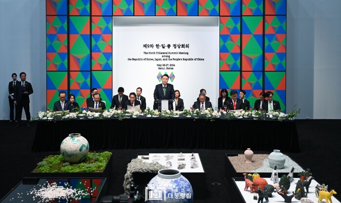 [뉴스힘=박노신 기자] 윤석열 대통령은 지난 5월 26일 서울에서 제9차 한·일·중 정상회의에 참석한 기시다 일본 총리와 리창 중국 총리를 비롯한 3국 대표단을 환영하는 만찬을 함께했다.