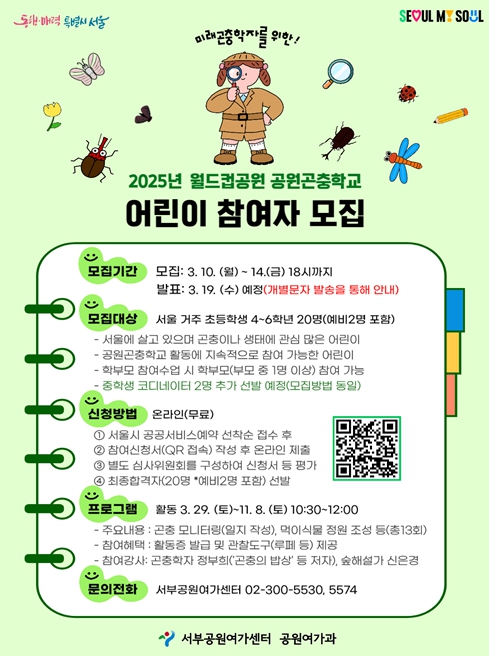 모집기간은 오는 3월 10일부터 3월 14일 18:00까지이며, 신청은 서울시 공공서비스예약시스템에서 예약 후 안내된 QR코드로 접속하여 온라인으로 신청서를 제출하면 된다. 발표는 3월 19일 참여자에게 개별 안내한다. 곤충학교 우수 활동자(참석률 70% 이상)에게는 서울시 서부공원여가센터에서 발급하는 활동증이 제공될 예정이다.