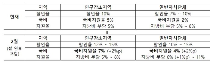 국민이 받는 할인율이 최대 15%까지 상승함에 따라 발생하는 지자체의 부담을 덜어주기 위해, 국비지원율 2월분을 2%p 상향하여 인구감소지역은 5%→7%로, 일반자치단체는 2%→4%로 올린다.