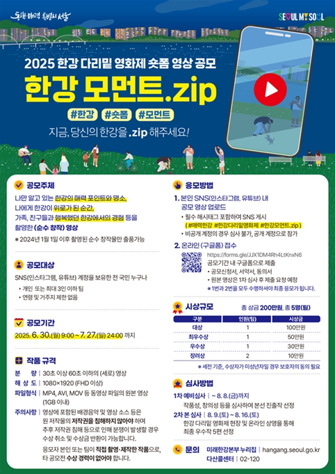 박진영 서울시 미래한강본부장은 “무더운 여름 밤 한강에서 가장 시원한 공간에서 열리는 '2025 한강 다리밑 영화제'를 맞아 한강을 사랑하는 분들이 참여할 수 있는 숏폼 영상 공모전을 마련했다”며 “이번 공모전을 계기로 한강의 아름다움을 널리 알리고 모두가 함께 공감하고 즐길 수 있도록 많은 참여를 바란다”고 전했다.