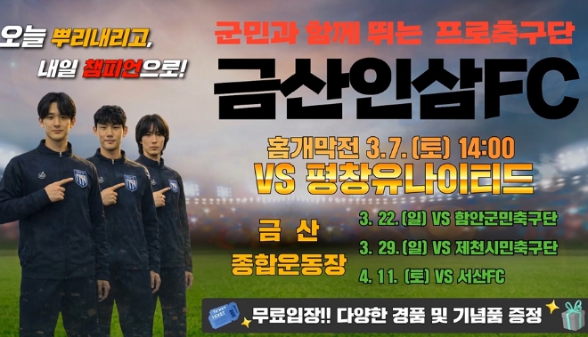 [뉴스힘=박노신 기자] 금산의 열정을 대표하는 금산인삼 에프씨(FC)가 오는 3월 7일 오후 2시 금산종합운동장에서 평창 유나이티드를 상대로 시즌 홈 개막전을 개최한다.
