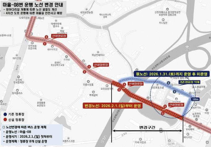 | ▲ "더 안전하고 쾌적하게"… 마을-08번 버스, 방아다리길 개통 맞춰 노선 조정 |