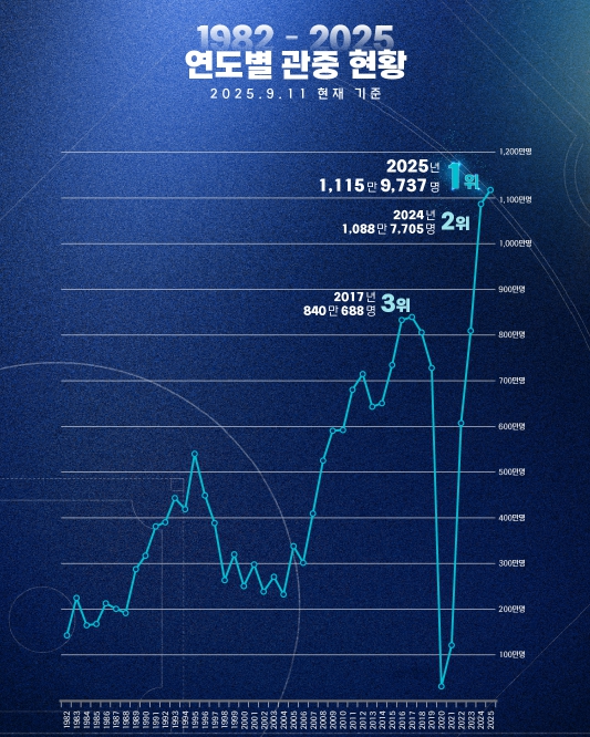 KBO 리그는 출범 첫 해인 1982년부터 지난 해까지 치러진 정규시즌 2만 2,860경기에서 누적 1억 8천 884만 1,044명으로 2억 관중 달성까지 1천115만 8,956명을 남겨두고 2025 시즌을 맞이했다. 어제 9월 11일(목)까지 1천115만9,737명의 관중이 입장하며 정규시즌 누적 2억 781명을 기록했다