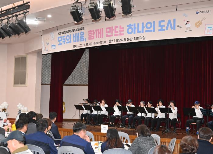 이어진 학습자 공연에서는 하남시장애인복지관의 하모니카 연주를 비롯해 시각장애인연합회 하남시지회의 노래 공연, 평생학습동아리 ‘비발디라인댄스’의 라인댄스, 하남시평생학습관 시니어스마트교육팀의 숟가락난타 등이 펼쳐져 참석자들의 큰 박수를 받았다. 또한 경기도 성인문해교육 시화전 우수학습자의 시 낭송도 이어져 감동을 더했다.