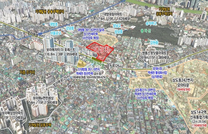 사업 대상지는 지하철 7호선 신대방삼거리역과 상도로에 인접해 가산·대림 및 사당·이수로의 접근성이 우수한 배후 주거지로서, 역세권을 중심으로 생활중심지 육성이 필요한 지역이다.