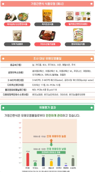 현재 가정간편식은 구성 재료별로 유해오염물질 안전기준을 설정해 관리하고 있으나, 최근 소비 증가에 따라 제품 형태를 고려한 종합적인 안전성 평가 필요성이 제기되어 선제적으로 위해평가를 추진했다.