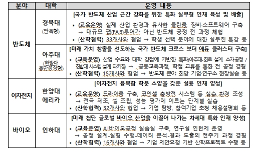 ‘첨단산업 특성화대학 재정지원사업’은 첨단산업 성장에 발맞춰, 분야별 특화 인재양성을 위한 특성화대학을 집중 육성하는 사업이다. 2023년 반도체 분야에서 시작하여 이차전지, 바이오 분야로 확대했으며, 2026년에는 피지컬 인공지능(AI) 시대 차세대 기술 주권 확보를 위하여 로봇 분야를 신설했다.