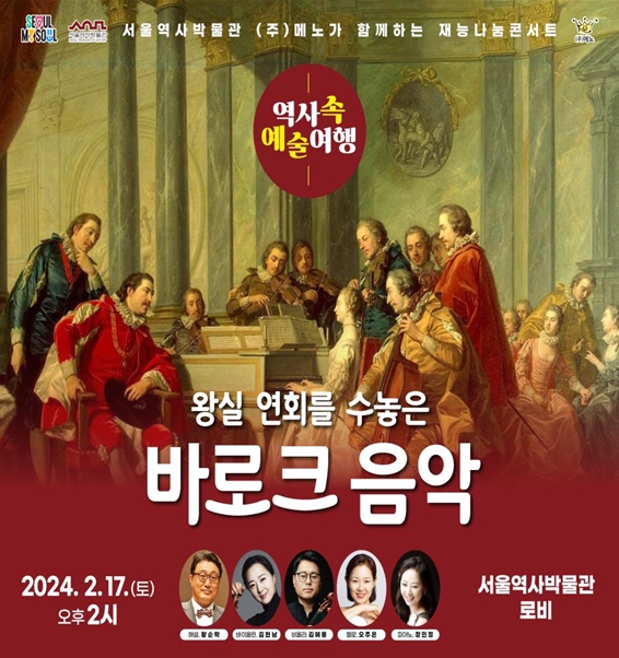 [뉴스힘=박노신 기자] 서울역사박물관은 '역사 속 예술 여행'이라는 테마로 2024년 재능나눔콘서트를 개최하며 ‘왕실 연회를 수놓은 바로크 음악’을 주제로 오는 2월 17일 오후 2시 박물관 로비에서 첫 연주회를 선보인다.