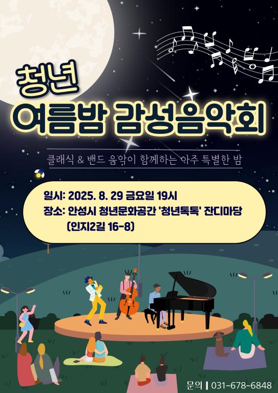 [뉴스힘=박노신 기자] 안성시는 야간경제 활성화를 위한 ‘오늘 안성 밤마실 어떠세요?’ 사업의 일환으로, 오는 8월 29일 금요일 오후 7시 안성시 청년문화공간 ‘청년톡톡’ 잔디마당(인지2길 16-8)에서 [SUMMER 스페셜-우리끼리] BING · BAND 청년 여름밤 감성음악회를 개최한다.