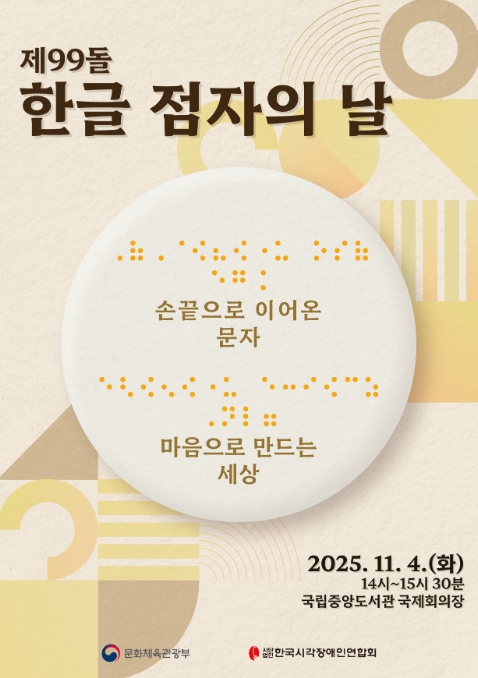 [뉴스힘=박노신 기자] 문화체육관광부는 한국시각장애인연합회와 함께 11월 4일 오후 2시, 국립중앙도서관에서 ‘제99돌 한글 점자의 날’ 기념식을 개최한다.