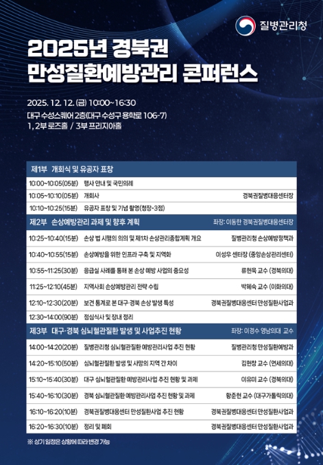 [뉴스힘=박노신 기자] 질병관리청 경북권질병대응센터는 12월 12일 10시 대구 수성스퀘어에서 지역사회 만성질환 관리 협력체계 강화를 위한 '2025년 경북권 만성질환예방관리 콘퍼런스'를 개최한다.