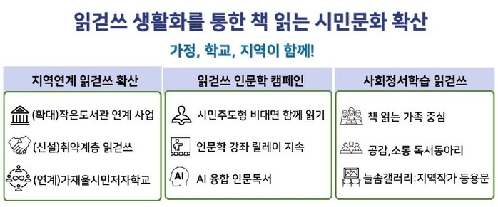 또한 생애주기별 맞춤 교육으로 ‘책 읽는 가족’ 문화 확산, 교과 연계 프로그램 강화, 독서·사유·실천을 잇는 인문학 캠페인을 중점 추진하여 지역과 연계한 ‘읽걷쓰’실천을 추진할 계획이다.