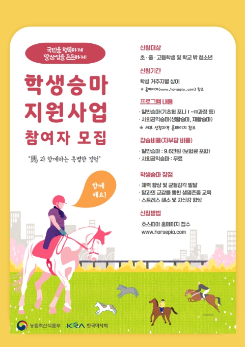 특히, 농식품부는 ‘학생도 말도 건강하고 안전한 승마’를 위해서 승마시설 의무보험 강화, 말 복지 저해 사업장 패널티 부여 등 학생승마 사업 개선을 추진했다.