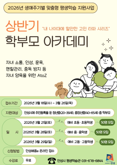 [뉴스힘=박노신 기자] 안성시는 시민의 생애주기별 학습 수요에 맞춘 평생교육 기회를 확대하기 위해 '2026년 생애주기별 맞춤형 평생학습 지원사업'의 일환으로 상반기 학부모 아카데미를 운영한다고 밝히고, 지난 3월 17일 1차 모집을 완료했다.