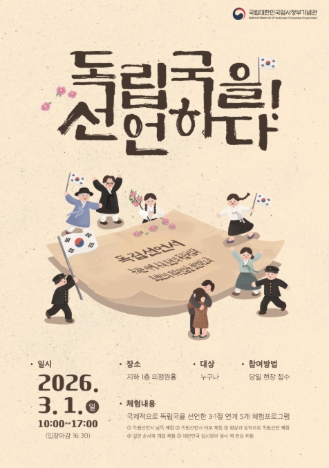 [뉴스힘=박노신 기자] 국가보훈부는 제107주년 3·1절을 맞아 3·1운동에서 독립선언 과정을 체험할 수 있는 체험프로그램과 문화행사가 국립대한민국임시정부기념관(서울 서대문구)에서 다채롭게 펼쳐진다고 밝혔다.