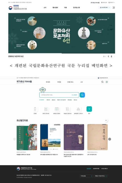 ‘국가유산 지식이음’ 누리집과 함께 연구원 국·영문 누리집도 사용자 친화적으로 화면을 재정비하고, 정보를 눈에 띄게 배치하는 등 사용자 인터페이스(UI)의 편의성을 높여 개선했다.