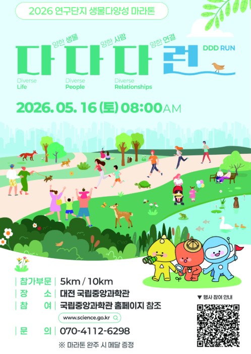 [뉴스힘=박노신 기자] 과학기술정보통신부 국립중앙과학관은 생물다양성의 소중함을 온몸으로 체감하고 일상 속 친환경 실천 문화를 확산하기 위한 2026 연구단지 생물다양성 마라톤 ‘다다다런(다양한 생물, 다양한 사람, 다양한 연결)’을 개최한다고 밝혔다.
