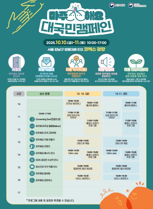이번 캠페인은 ‘서로의 정신건강을 함께 마주한다’는 의미를 담은 정신건강 캠페인 브랜드 '마주해요'의 일환으로, 국민이 직접 참여하는 다양한 전시·체험·공연을 통해 정신건강의 중요성을 알리고, 정신건강에 대한 긍정적 공감대 확산을 목표로 한다.